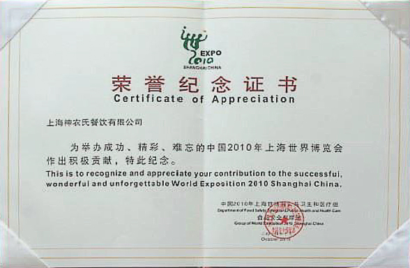2010上海世界博覽會榮譽(yù)紀(jì)念證書